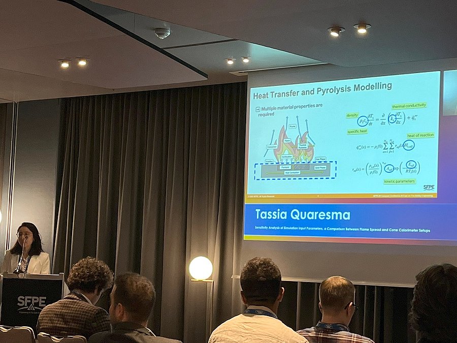Im März 2023 hat Tássia Quaresma unsere Arbeiten im Bereich der Sensitivitätsanalysen auf der SFPE Konferenz in Berlin vorgestellt. Sie hat einen Vortrag mit dem Titel "Sensitivity analysis of simulation input parameters, a comparison between flame spread and cone calorimeter setups" gehalten.
